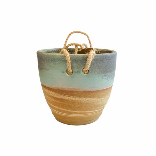 • Hand thrown stoneware hanging planter which looks like a beach scene