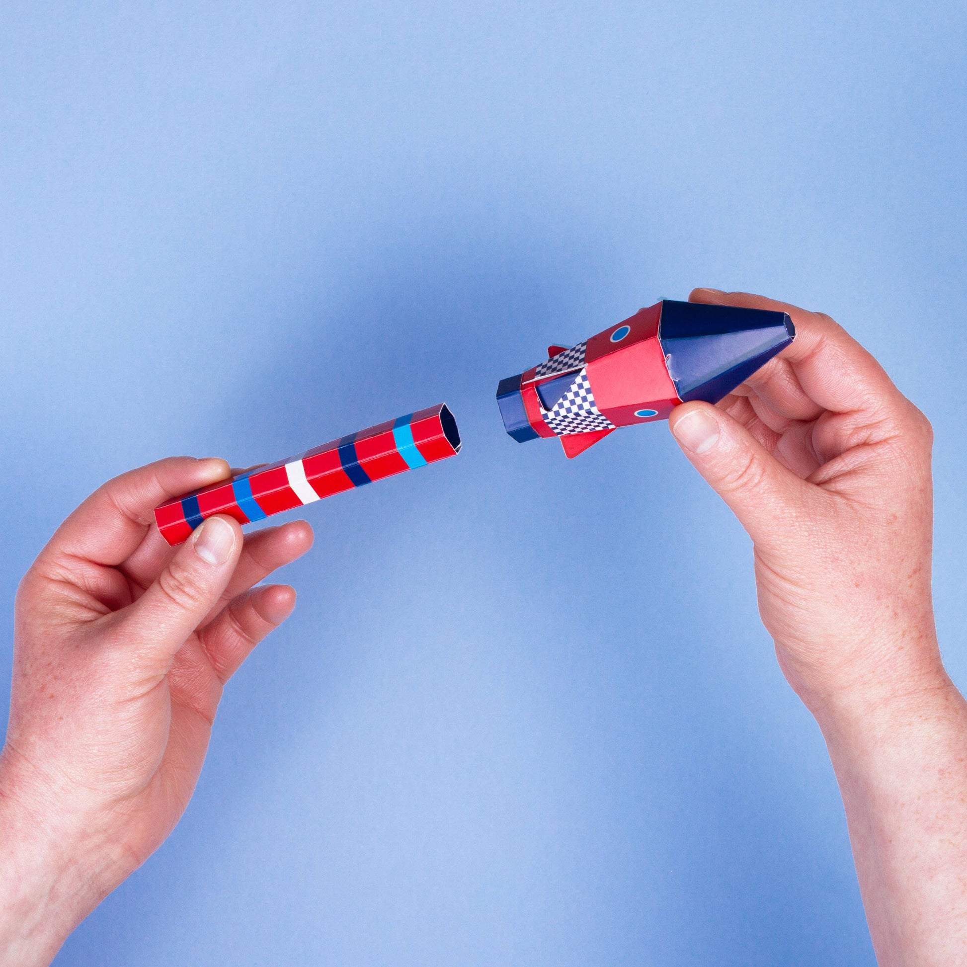 Build and launch your own reversible blow rocket. Send your rocket into space and win points by returning it to the landing pad. Full of space jokes and facts with no glue or scissors needed.