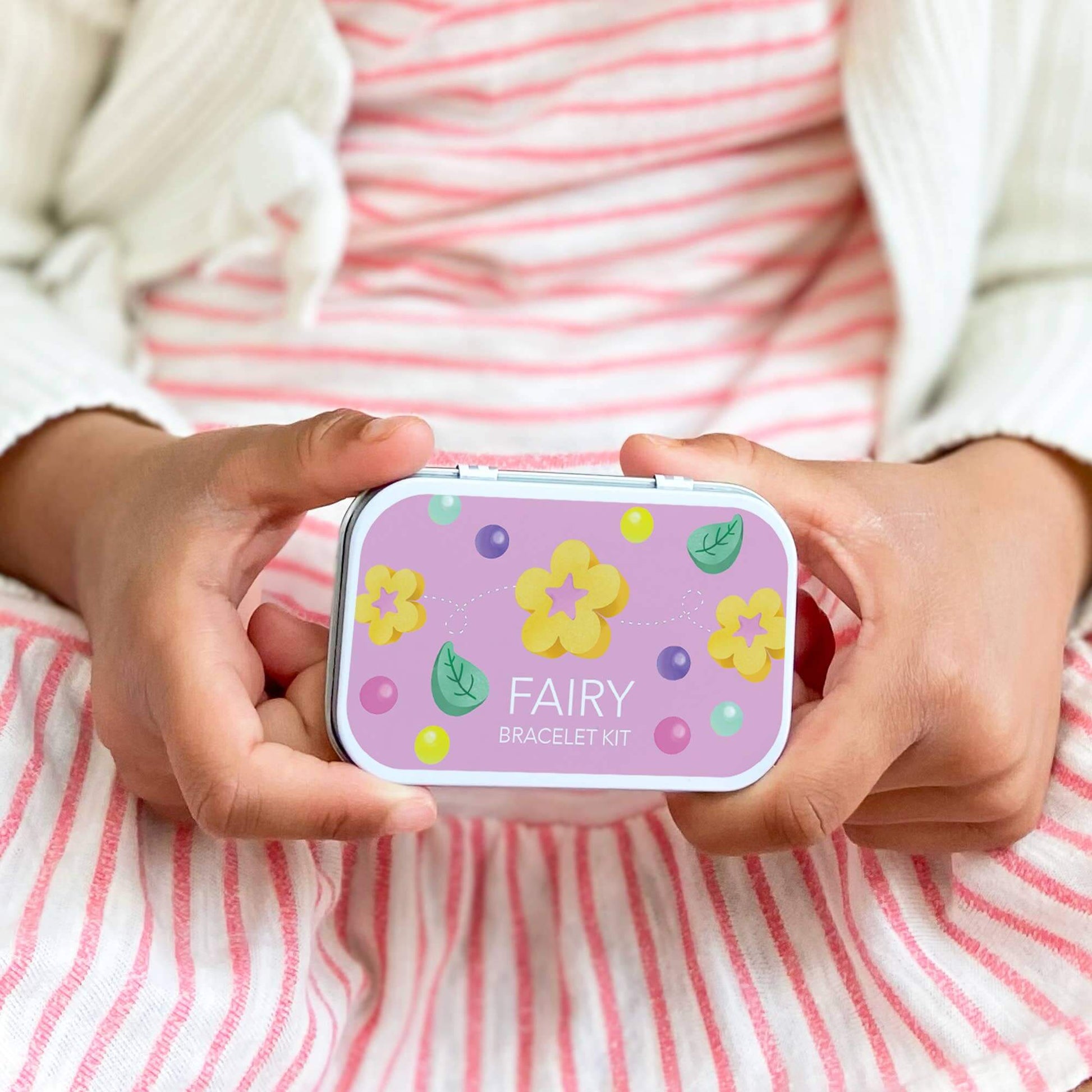 A beautiful gift tin containing elastic & beads to create a pretty wooden flowery fairy bracelet.