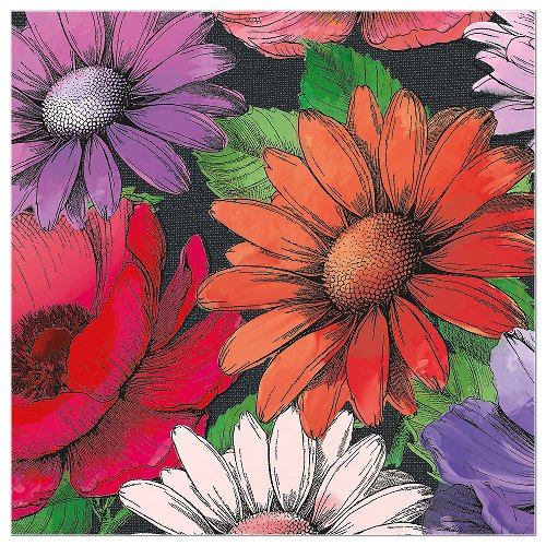 Bring a touch of charm and freshness to your table setting with these daisy head paper napkins. Covered in Flowers in various shades of purple, and orange on a dark background, each napkin creates a timeless, nature-inspired look. Designed with a printed finish that mimics fabric, they give your table an elegant touch without the hassle of washing.