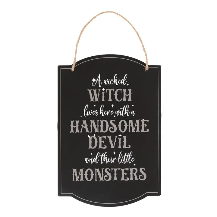 Bring spooky fun to your home this season with the hanging Halloween Sign – "A Wicked Witch Lives Here with a Handsome Devil and their Little Monsters."